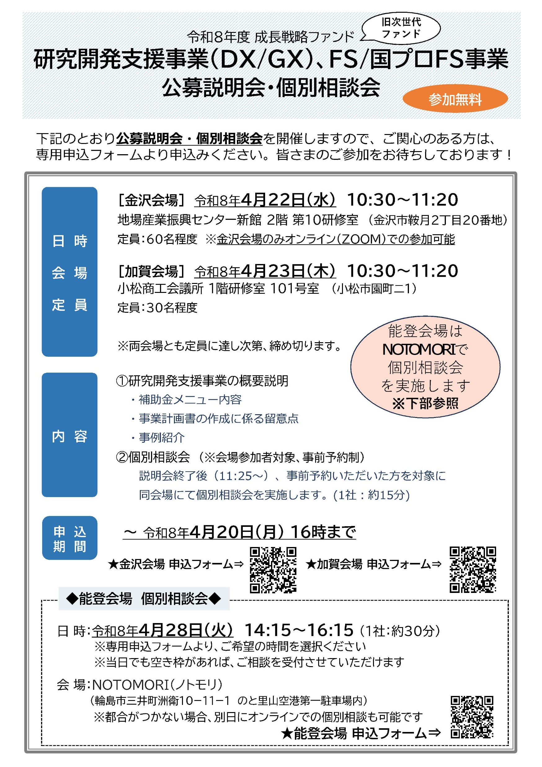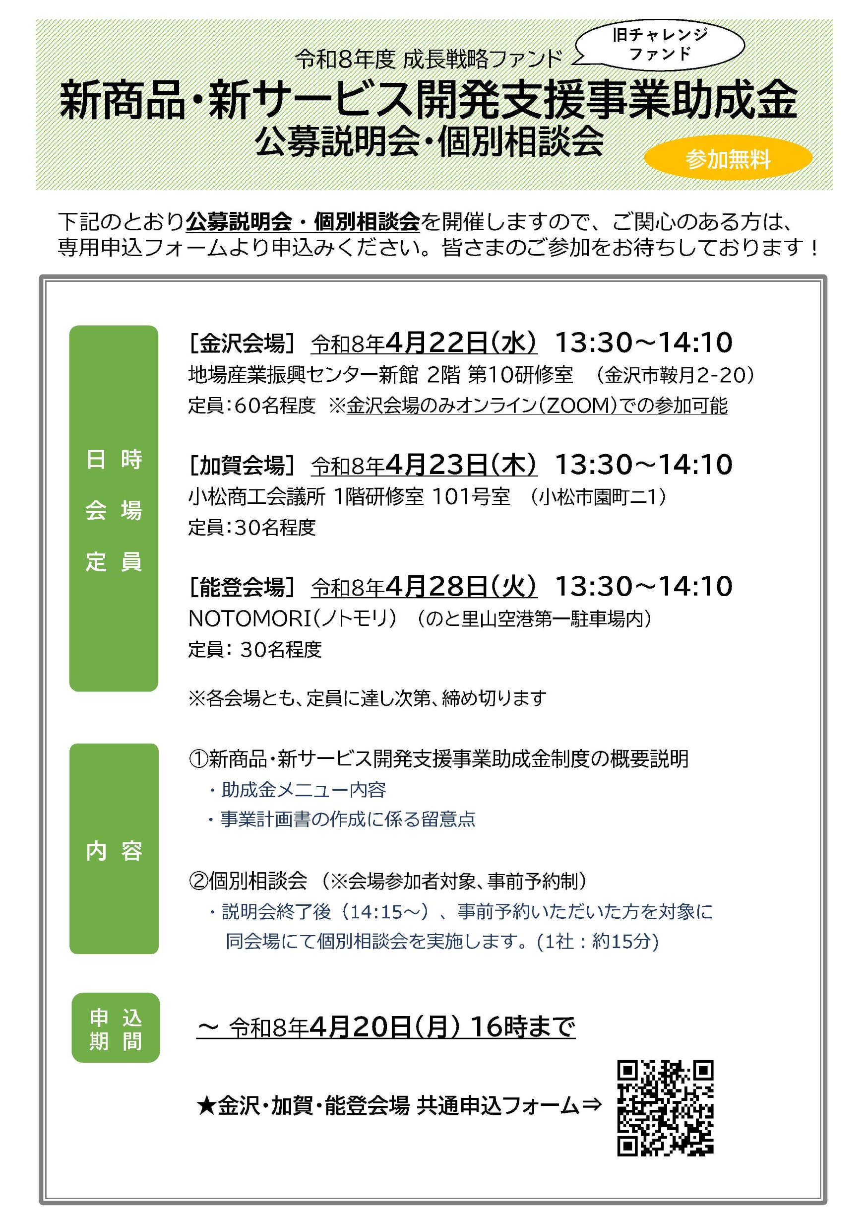 県では、700億円規模の「成長戦略ファンド」として研究開発支援、新商品・新サービス開発支援、スタートアップ創出支援等のメニューで、複数年にわたる新たな研究、商品開発から事業化、販路開拓まで、一貫して支援を行っております。 (参考)成長戦略ファンド:https://www.isico.or.jp/site/shinseihin/ R8年度は下記日程で公募説明会を実施いたしますので、関係者の皆様、研究開発・商品開発等に取り組まれる中小企業者等の皆様へ周知いただき、ご活用いただけましたら幸いです。 【公募説明会日程等】(詳細は添付のチラシをご覧ください) ●金沢会場(オンライン併用) 日時:4月22日(水) 10:30~11:20(研究開発支援事業) 13:30~14:10(新商品・新サービス開発支援事業) 会場:石川県地場産業振興センター 新館2階 第10研修室 定員:60名程度 ●加賀会場 日時:4月23日(木) 10:30~11:20(研究開発支援事業) 13:30~14:10(新商品・新サービス開発支援事業) 会場:小松商工会議所 1階研修室101号室 定員:30名程度 ●能登会場 日時:4月28日(火) 13:30~14:10(新商品・新サービス開発支援事業) ※研究開発は個別相談のみ14:15~16:15 会場:NOTOMORI(ノトモリ)(のと里山空港第一駐車場内) 定員:30名程度 【説明会申し込みフォーム】 ※分野で申込URLが異なります。 ※申し込み期限:4月20日(月)16時 <研究開発支援事業> 4/22金沢会場&オンライン https://www.isico.or.jp/ques/questionnaire.php?openid=477 4/23加賀会場 https://www.isico.or.jp/ques/questionnaire.php?openid=478 4/28能登会場(個別相談会のみ) https://www.isico.or.jp/ques/questionnaire.php?openid=479 <新商品・新サービス開発(全日程共通)> https://www.isico.or.jp/ques/questionnaire.php?openid=218<https://www.isico.or.jp/ques/questionnaire.php?openid=218&check>